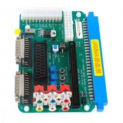 Im Videobereich bietet die Platine einen direkten RGBS Ausgang über RCA Anschlüsse sowie einen EUR SCART Ausgang, wodurch das originale Videosignal des Arcade Boards für eine authentische Bildqualität erhalten bleibt. Sie verfügt über eine separate Helligkeitsregelung sowie eine RGB Pegelanpassung zur präzisen Bildkalibrierung.