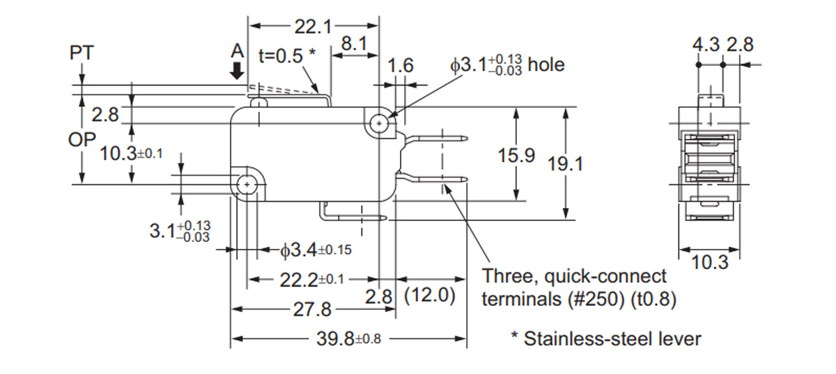 Este modelo incorpora 3 terminales faston de 4,8mm (NO / NC / COM), lo que permite una instalación rápida y sencilla mediante conectores estándar, sin necesidad de soldadura. Gracias a su construcción robusta y a la calidad reconocida de Omron, ofrece una activación precisa y una larga vida útil incluso en entornos de uso intensivo.