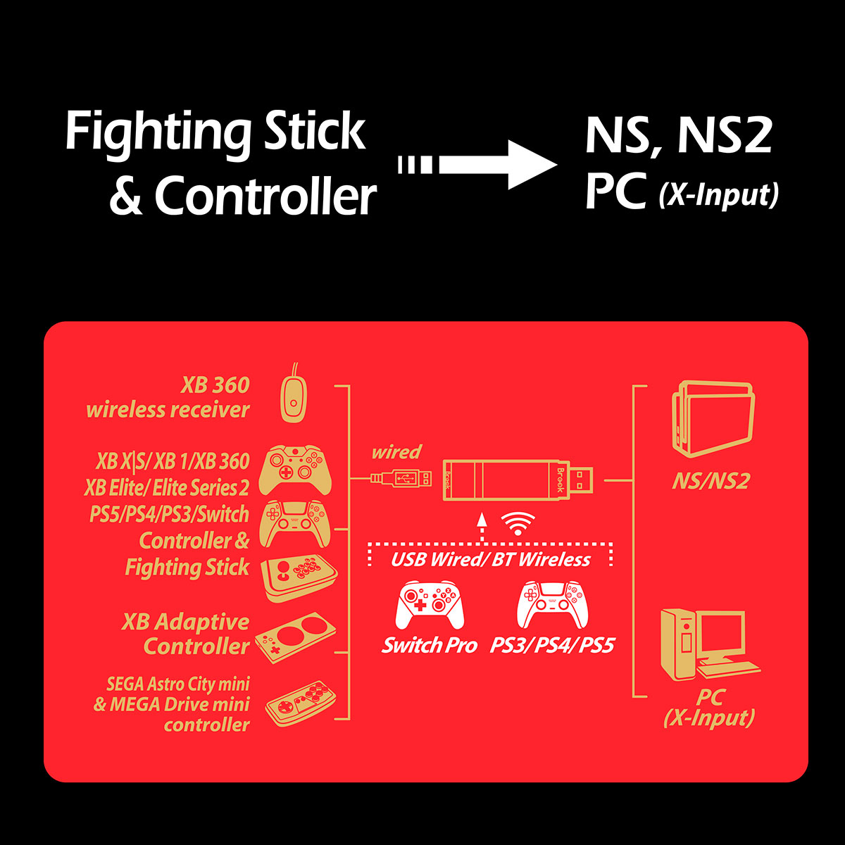 L'adattatore USB Wingman NS è un prodotto che consente di collegare i controller PS5, PS4, PS3, Xbox 360 / Xbox One / Xbox Elite 1&2 / Xbox Series X|S e Switch Pro a una console Nintendo Switch o a un PC.