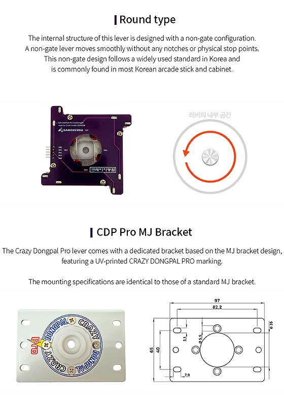 L’asse con sistema di ritenzione a vite garantisce stabilità e durata, mentre la piastra di montaggio tipo MJ, con incisione UV esclusiva “Crazy Dongpal Pro”, assicura compatibilità con montaggi standard e una finitura premium. Include un connettore a 5 pin, facilitando l’installazione su fightstick e sistemi arcade moderni.